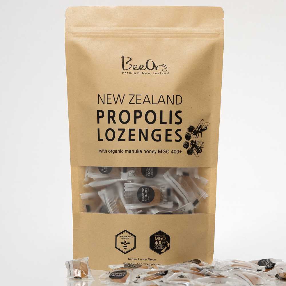 - BeeOrg Propolis Lozenges contain rare and high-rating Certified Organic Manuka Honey MGO400+.